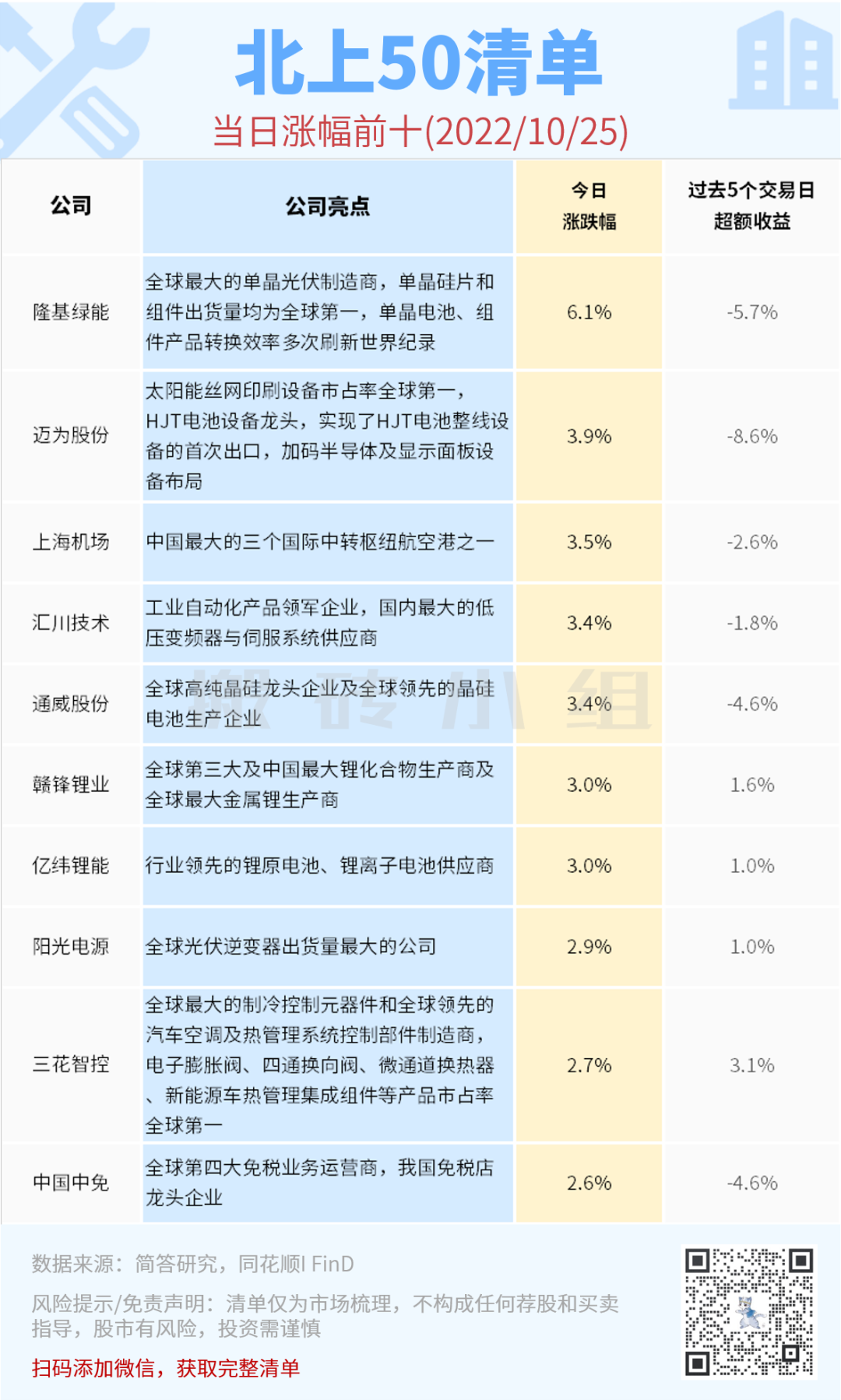北上50榜单今天表现分化,新能源上涨,金融医药下跌,市场关注点依然在成长+科技的制造业上。