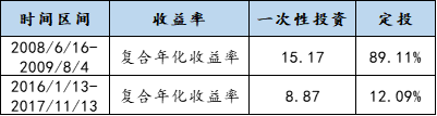 注:时间段选取2008年6月16日至2009年8月4日和2016年1月13日至2017年11月13日,按每周四定投买入1000元上证指数模拟计算。风险提示:以上测算仅作示例,不作为收益保证或者投资建议;所引用指数在特定期间的收益率表现不能代表基金现在或未来的收益表现。基金有风险,投资需谨慎。