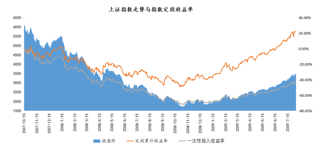 注:时间段选取2007年10月15日至2009年8月4日,按每周四定投买入1000元上证指数模拟计算。风险提示:以上测算仅作示例,不作为收益保证或者投资建议;所引用指数在特定期间的收益率表现不能代表基金现在或未来的收益表现。基金有风险,投资需谨慎。