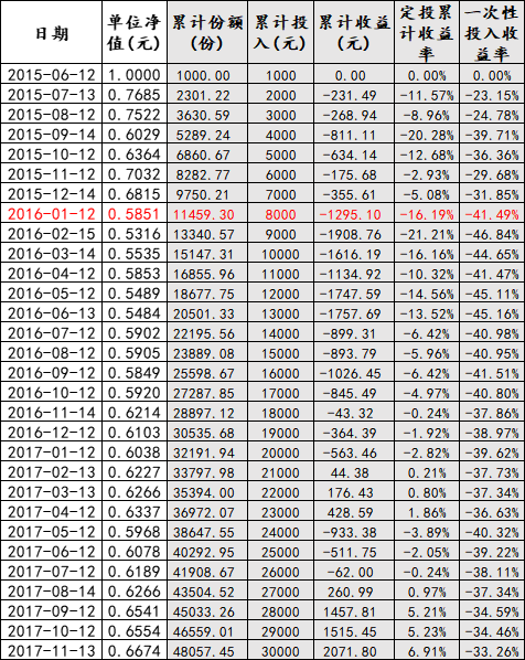 选取的时间段是2015年6月12日至2017年11月13日,就相当于是从牛市的顶点开启定投,且定投标的选择为上证指数。这个搭配相当于是很差的定投起始点+很瘟的标的,组成这一对主要就是想褪去所有的光环,单纯的观察一波数据变化。