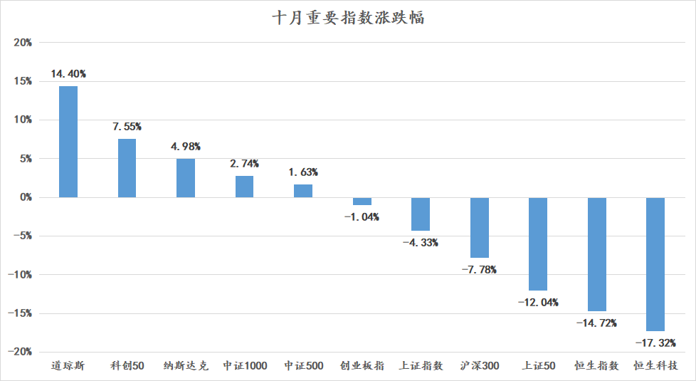 昨晚复盘了一下10月各大市场的走势,如图所示,跌幅冠军毫无疑问是港股,恒生科技-17%,恒生指数-14%,美股的道指是涨幅冠军,这个归属不算意外,但14%这个幅度确实超出了预期,看了下K线这尼玛都快反转了。。