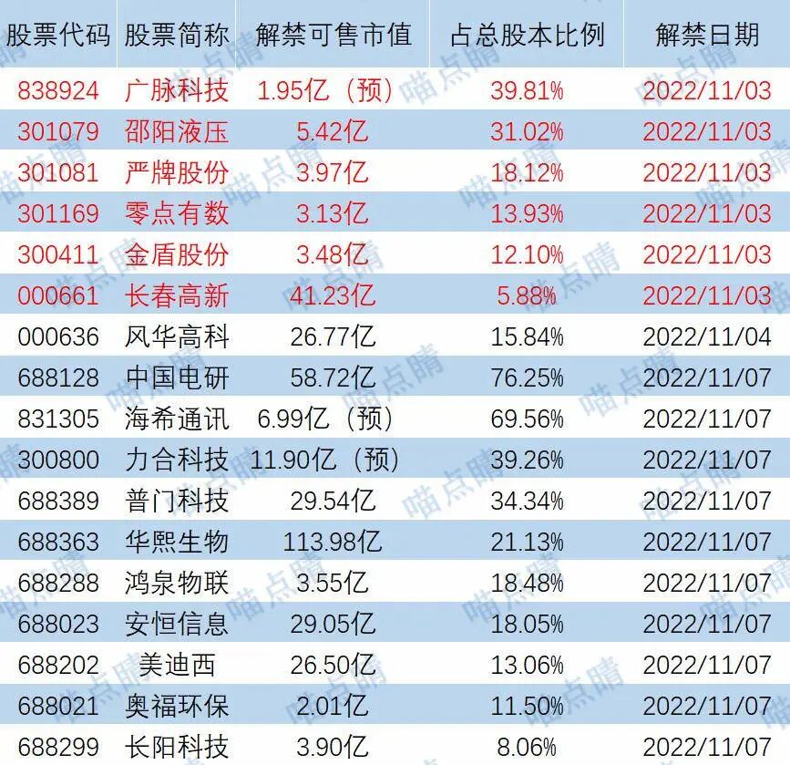 今天广脉科技、邵阳液压等有大额可售解禁。