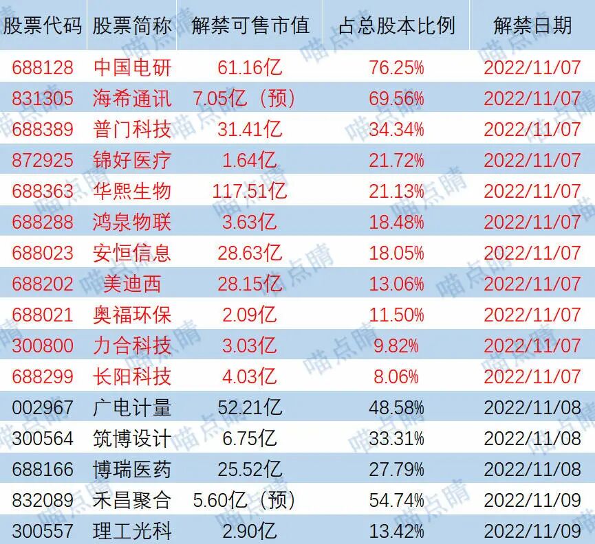 今天中国电研、海希通讯等有大额可售解禁。