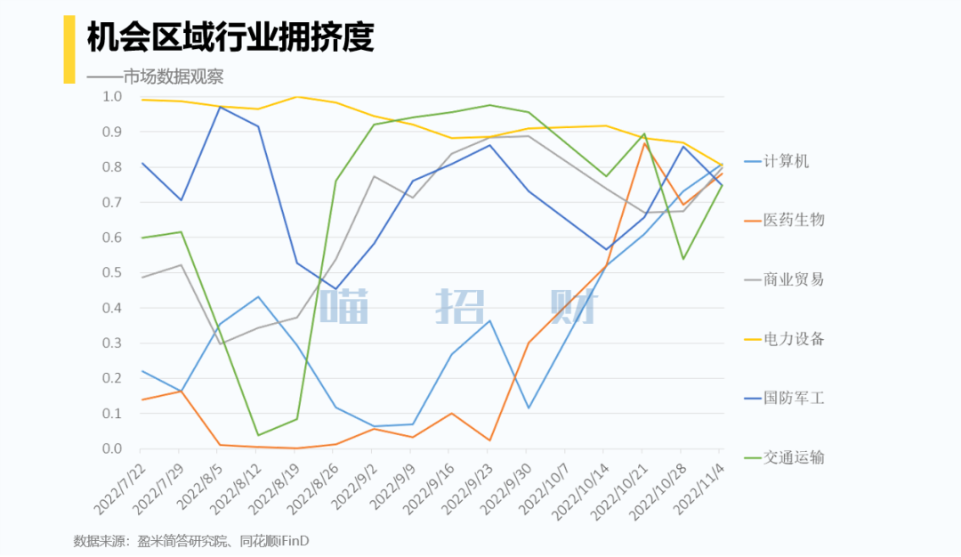 行业拥挤度看,机会区域内的方向还挺有意思的,计算机、医药、电力设备、军工都是市场最近讨论比较多的方向,后面要关注这些谁能上90%进入热门区域。