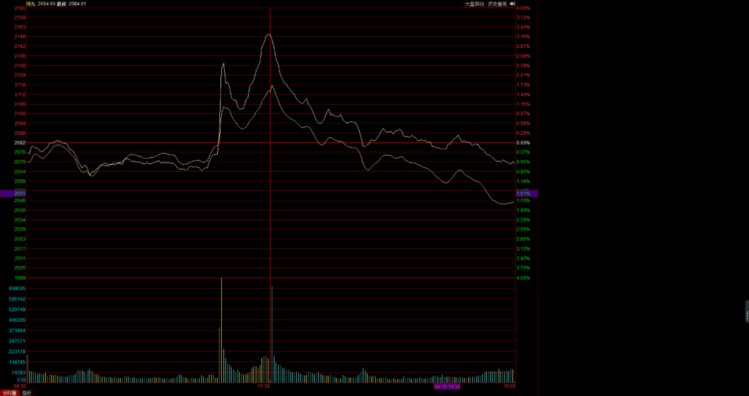说起乌龙指,最大波的一次就是13年光大乌龙指事件了,那次是交易程序出BUG,几十个权重股直接涨停,大家感受一下当天的指数走势。。