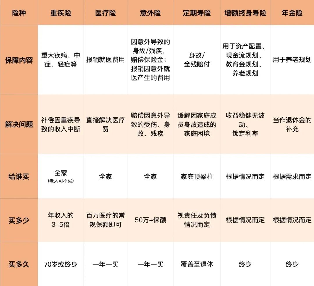 ◆ 定寿险:寿险是以人的死亡作为赔付标准的,这就决定了受益人一定不是本人。如果不幸去世,寿险能留下一笔钱给家人让他们得以继续生活。尤其是家庭的顶梁柱万一不在了,孩子的教育、老人的赡养、剩下的房贷都成问题。定期指的是只保障一定阶段,与终身寿险相比,定期寿险价格更低、杠杆更高、保障性更强。所以,非常推荐给家庭支柱购买定期寿险。当然啦,如果是夫妻二人共同赚钱养家的“双支柱家庭”,则建议夫妻二人都要投保。