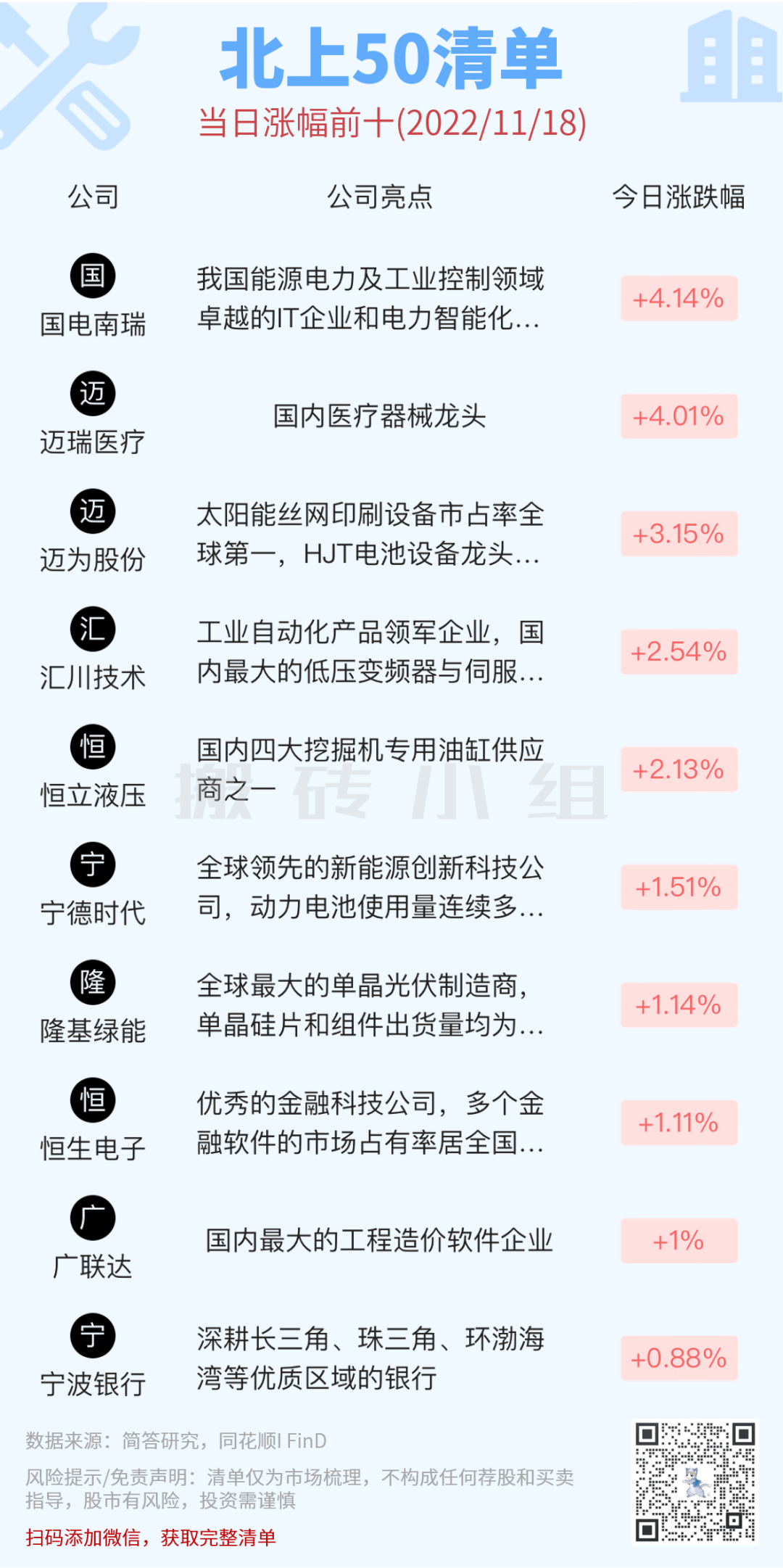 北上50榜单整体分化,涨跌各半,有意思的是有新能源龙头上涨幅前10了,新能源这一轮的杀跌有接近尾声的感觉。