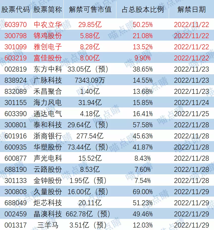 今天中农立华、锦鸡股份等有大额可售解禁。