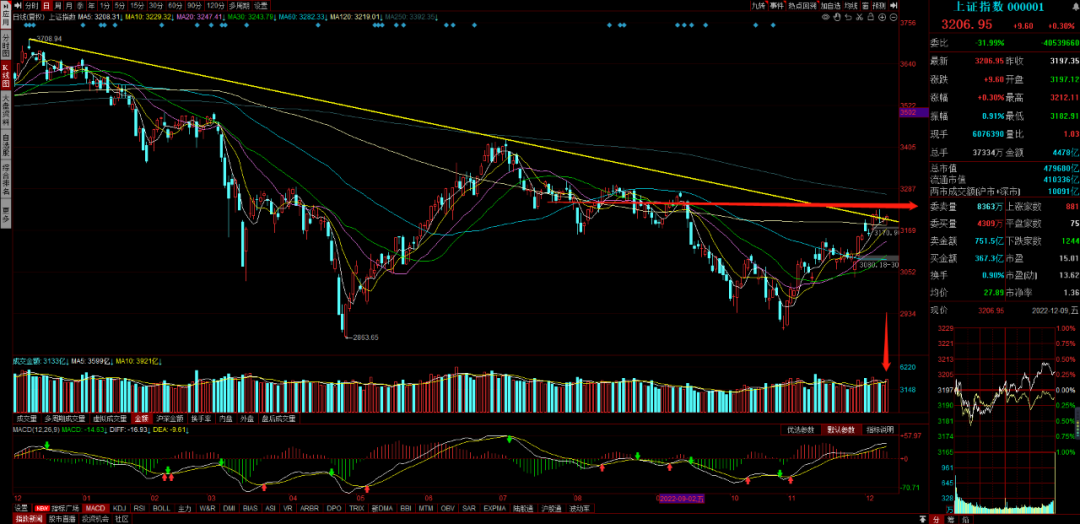 市场当下比较纠结,技术上看这里有下降趋势压力、年线压力以及前期套牢盘压力,理论上向上突破是比较难的,理应保持谨慎一点。但是这几天盘面的走势让我感觉比较强,如果后面有增量入场,那这些压力都将可能被突破;如果不能,那市场将保持箱体震荡走势。