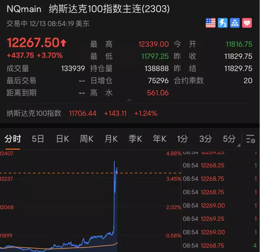 昨晚老美11月CPI数据出炉,11月同比上升7.1%,为2021年12月以来最小增幅,预估为7.3%,11月核心CPI同比上升6%,预估为6.1%。CPI低于预期的消息一出,美股直接沸腾了,正在交易的纳指主连瞬间跳涨4%。。