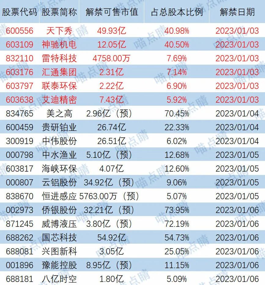 今天天下秀、神驰机电等有大额可售解禁。