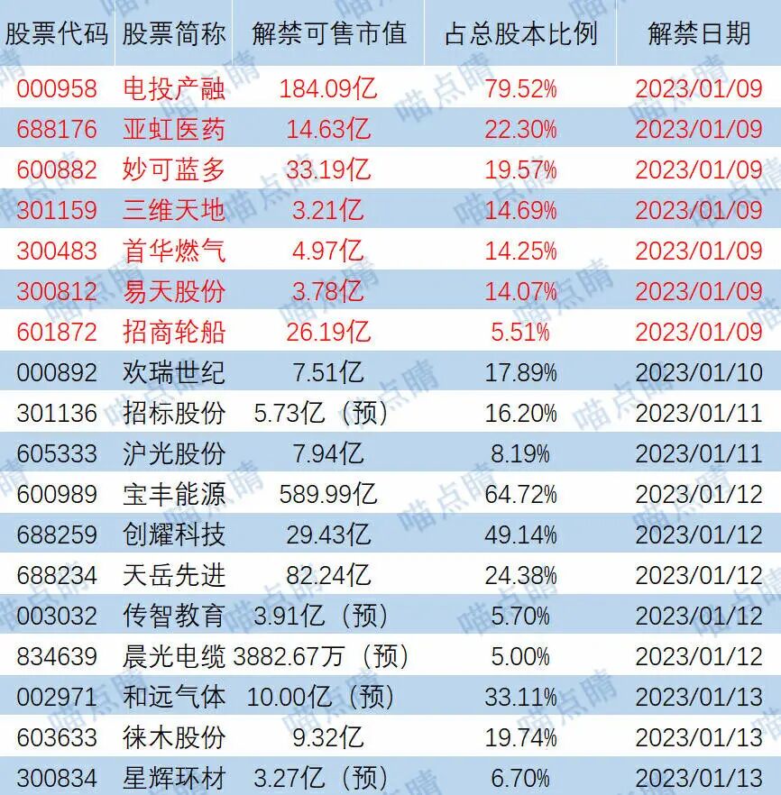 今天电投产融、亚虹医药等有大额可售解禁。