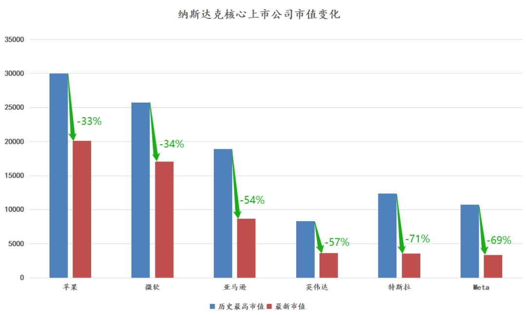 先摆几个客观事实:去年以来纳指这一轮的回撤幅度达34%,是自08年金融危机以来的最高;美国大型科网股血流成河,苹果从3万亿跌至2万亿,Meta市值缩水三分之二,特斯拉市值蒸发七成。
