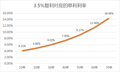 举个例子,好的储蓄险可以达到终身接近3.5%的复利,放70年,单利就是15%左右。