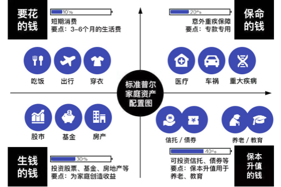 ③保本升值的钱:作为长期保本账户,为以后的养老、教育等刚性支出做准备。