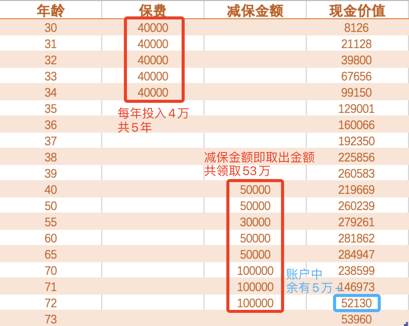 投保储蓄险,交多少钱,什么时候保单账户里有多少钱、能拿出来多少钱,都是写在合同里的,雷打不动。