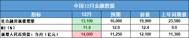 1、12月金融数据出炉,新增人民币贷款1.4万亿,M2同比增长11.8%,社融增量为1.31万亿。