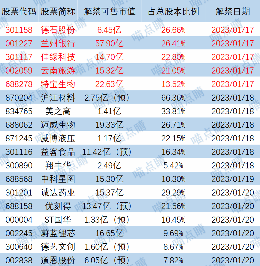 今天德石股份、兰州银行等有大额可售解禁。