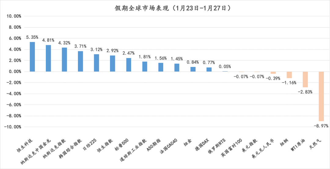 大伙在春节期间如果有什么有趣的见闻和感受,也欢迎到留言区聊聊。下面进入正题,聊下假期期间的资本市场,整体看外盘表现都还不错,尤其是中概方向的资产,纳指金龙指数和恒生科技领涨全球,可见节前外资的热情依然在延续着。