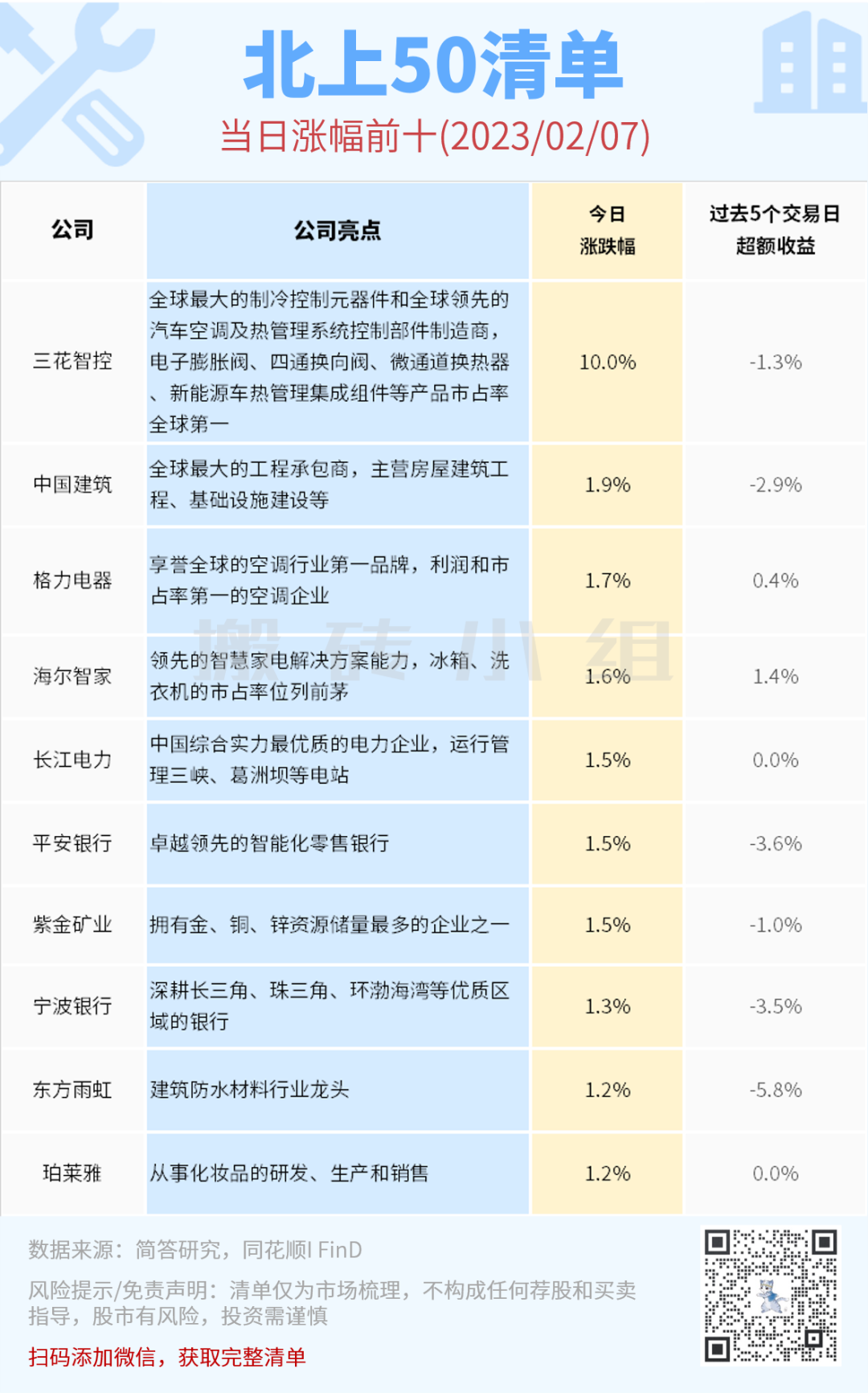北上50榜单表现一般,三花智控的涨停是跟着机器人炒的,权重方向看不出市场有强贝塔。