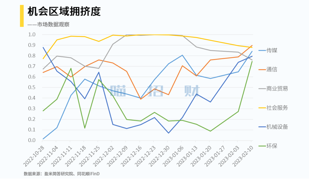 关注区域内的通信和传媒是被计算机带起来的拥挤度,较为独立的是环保和机械设备,这两块有关注的可以看看其自身逻辑。