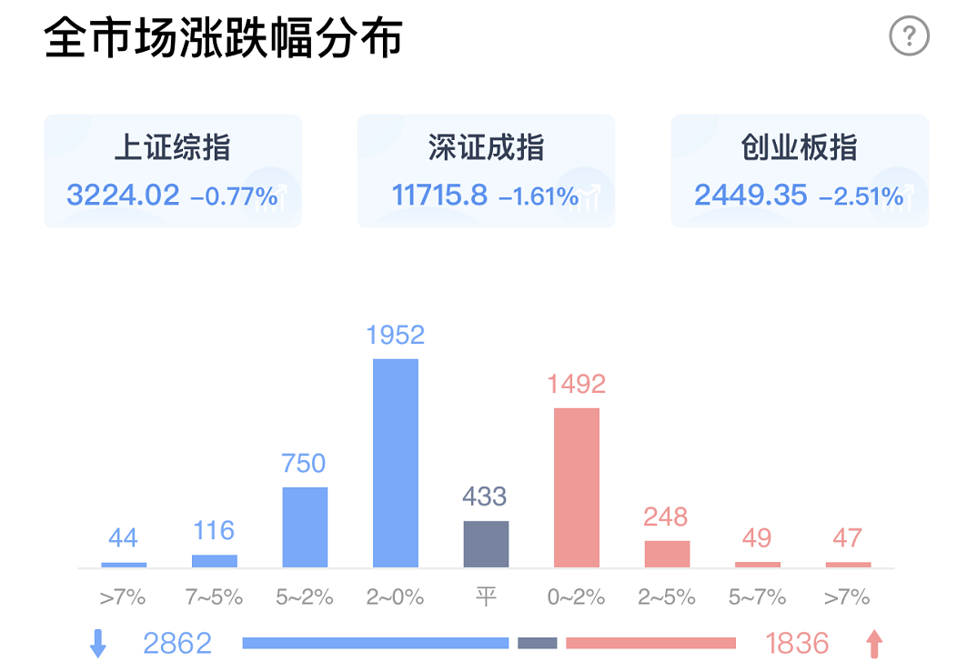 昨天市场日内巨震,今天延续震荡调整,指数全部收跌,创业板跌的比较狠一些。个股层面超过2800家下跌,亏钱效应满满。。