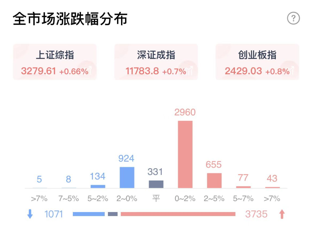 市场今天日内走了个V,上午高开后持续震荡下跌,下午2点后持续上涨。收盘看各指数都是小涨,个股超过3700家上涨,持续了好几天的调整总算是缓口气了。