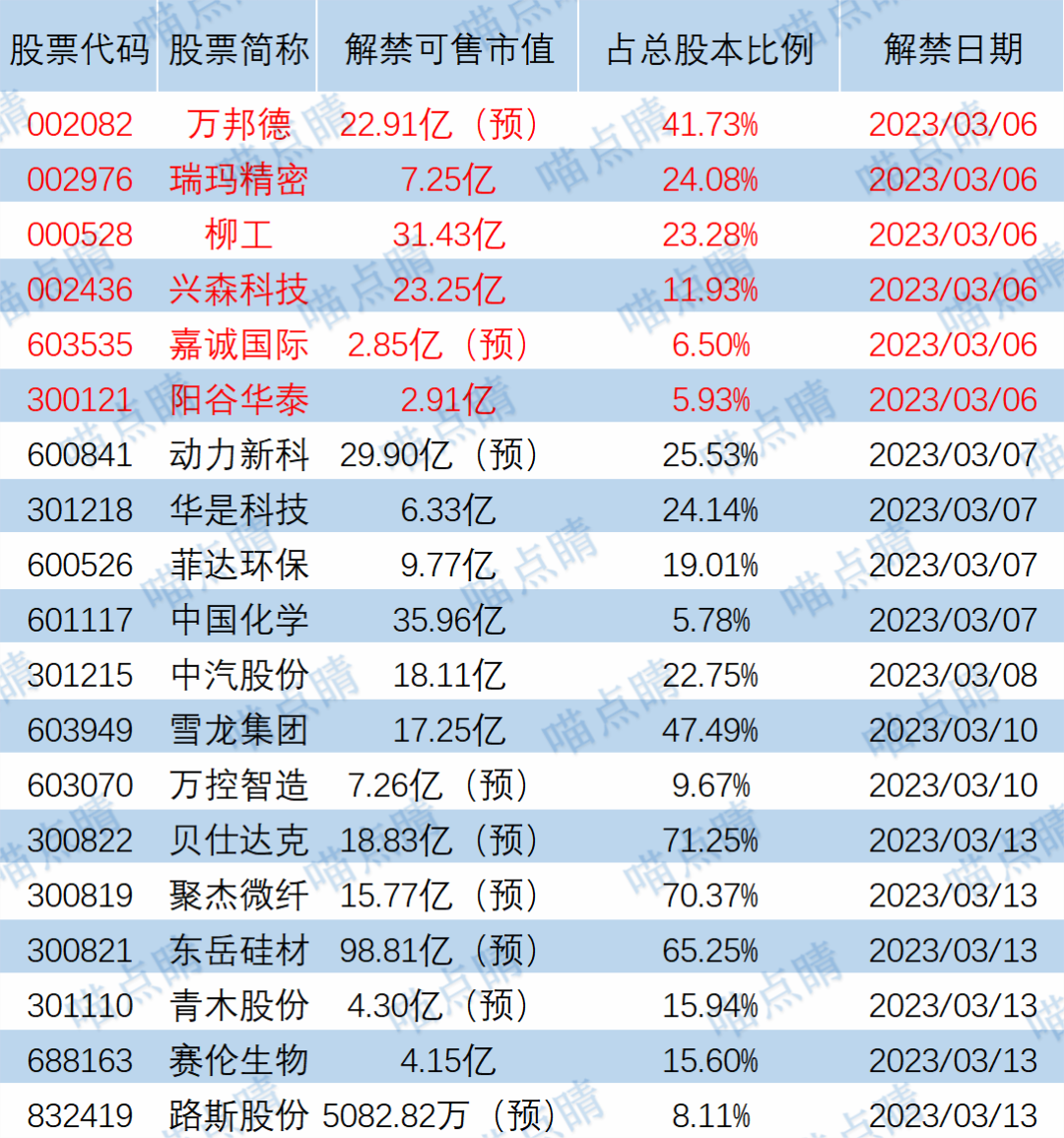 今天万邦德、瑞玛精密等有大额可售解禁。