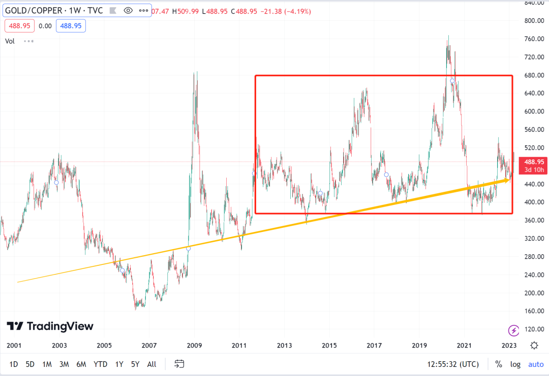 而第二个结论,就是金铜比和经济的规律。在金铜比向上的时候,通常意味着全球经济出现了危机或预期衰退,例如08年金融危机和20年的疫情,这两个事件打出了金铜比的峰值;金铜比向下的时候,说明经济在复苏的过程中,例如09年和20年疫情后的全球经济复苏都是一样的特征。