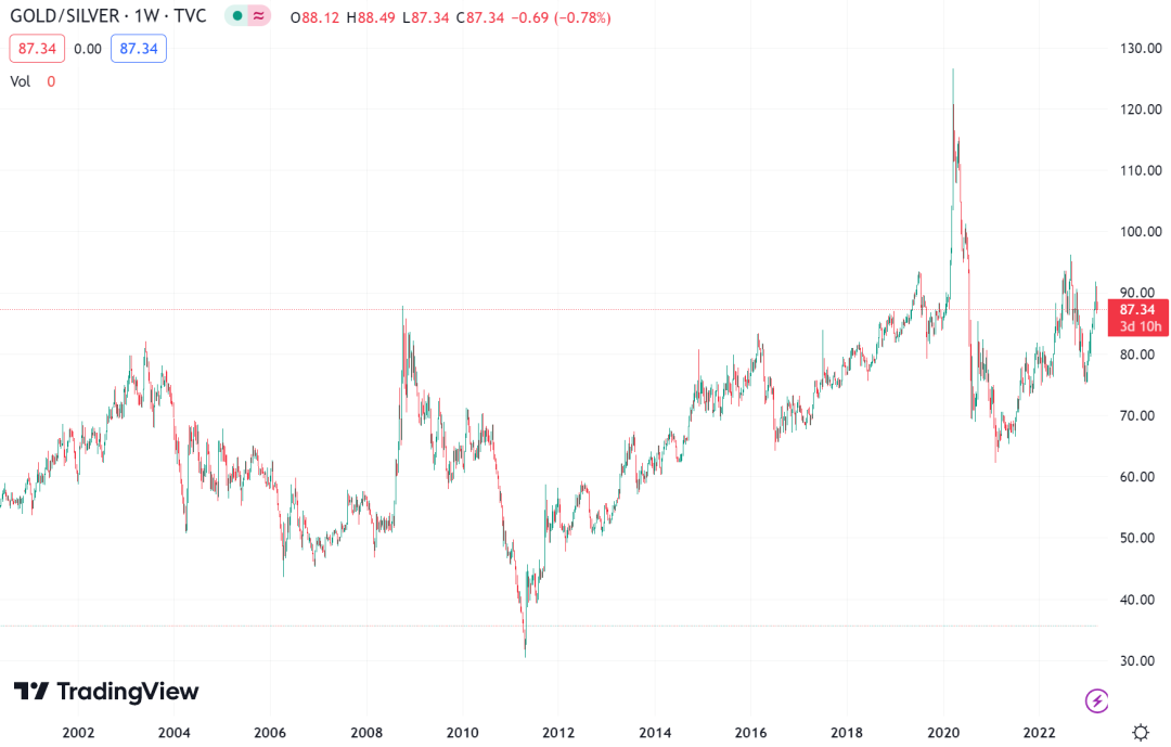 首先看常用的金银价格比,金银比咱很久以前就聊过,现在在90附近,历史上看是比较高的,按照规律看现在银的性价比可能比金更高一些。