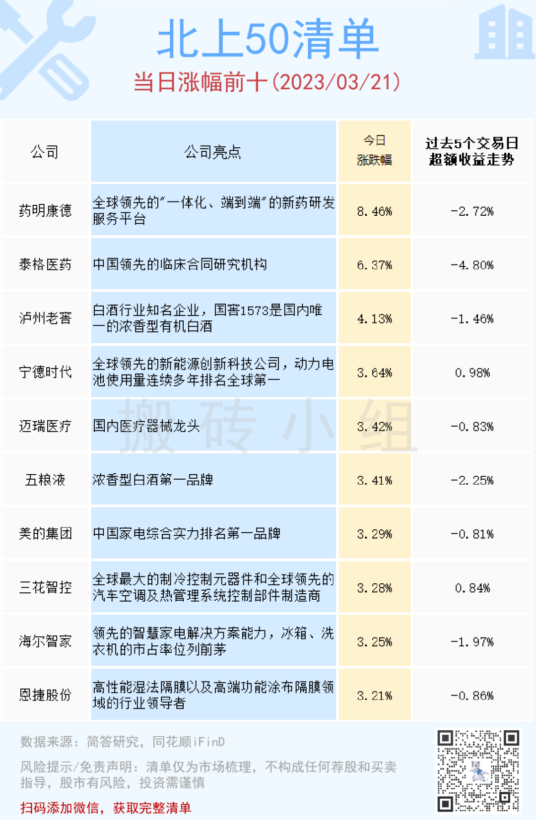 北上50榜单普涨,前10大多是茅指数相关的个股,很符合外资的口味,从图形上看大多是超跌反弹的走法。
