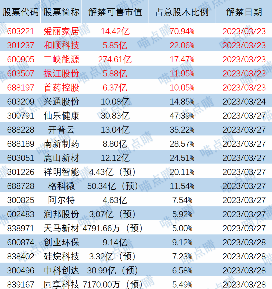 今天爱丽家居、和顺科技等有大额可售解禁。