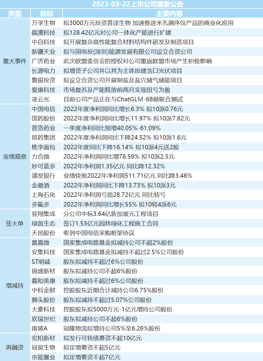 5、中国电信2022年净利润275.9亿元,同比+6.3%,拟10派0.76元,算上中期全年分红180亿元,约占净利的65%,电信兑现承诺。业务表现最亮眼的天翼云收入翻倍达579亿,今年目标千亿,此外表态今年数字化投资将增加40%,同时会在AI方面下功夫,提供大模型算力服务。