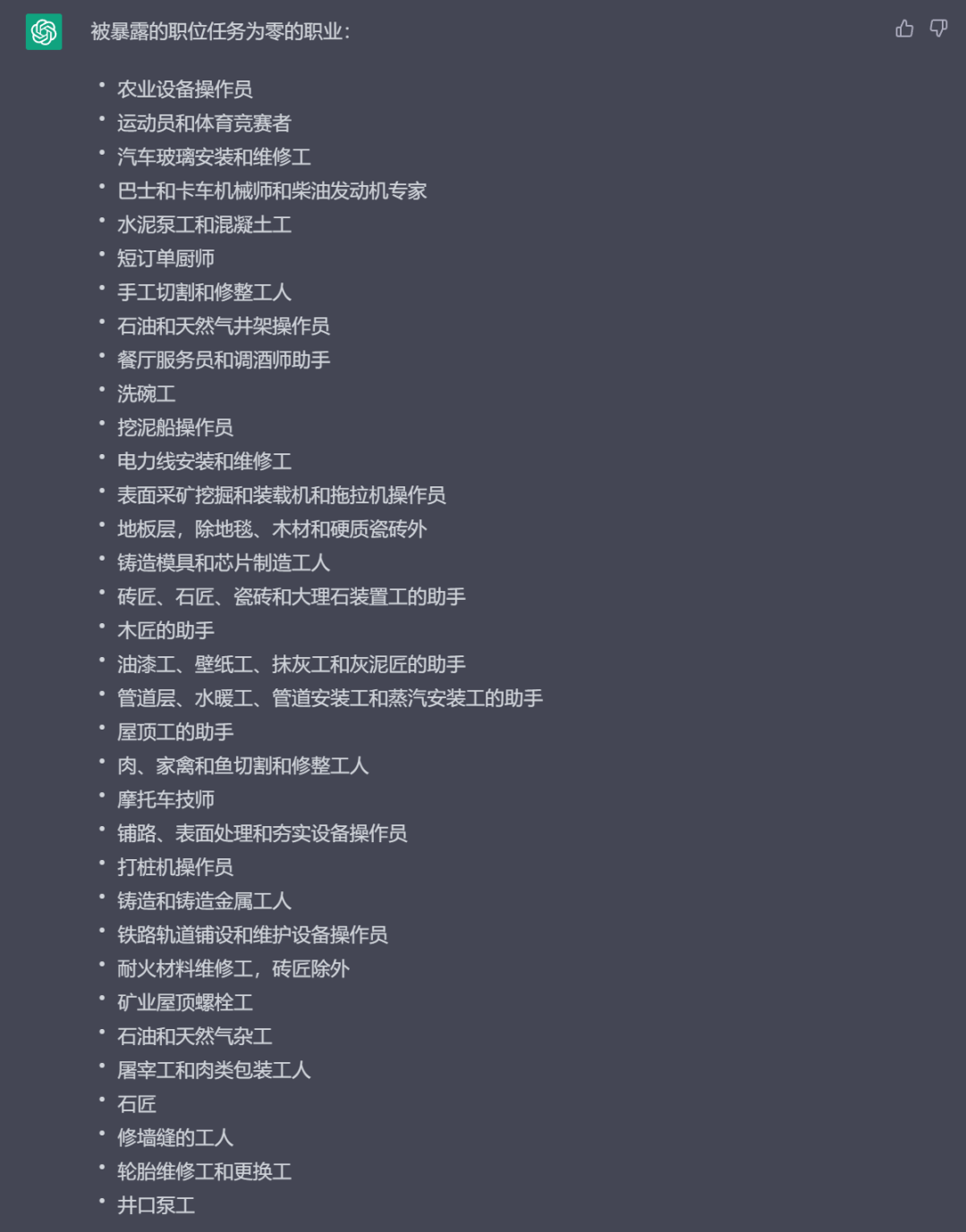 所以从行业的角度上看,金融、教育、电商、游戏、影视、办公等这类行业会受到比较大的影响,在这些行业内的大伙儿要加紧用上GPT来赋能自己的工作。论文里也讲到了一些职业并不会受到影响,让ChatGPT翻译后得到的是下面这些。