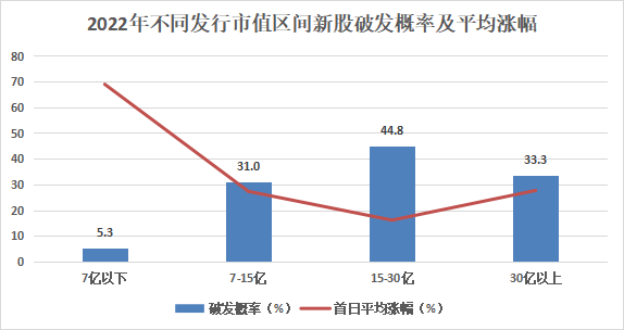 2、发行市值:小市值公司破发率会低一些,尤其是10亿以下发行的迷你股。而发行市值在15至30亿区间的新股破发率最高,然后当发行市值大于30亿时,破发率有所回落,原因跟上面的价格因子类似。
