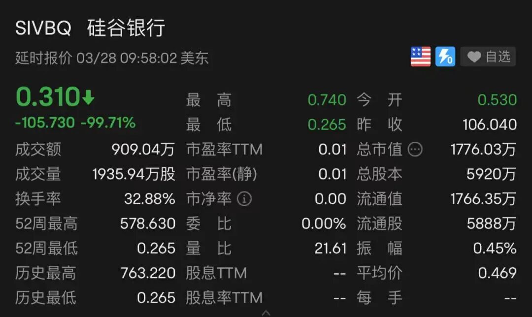 昨晚倒闭后被收购的硅谷银行和签名银行在OTC市场复牌交易了,二者均一度跌超99%,其中硅谷银行我看到那会就剩3毛了,要知道它两个月前还是300多。。此次欧美的银行危机通过这两笔收购暂时化解,但看似皆大欢喜的结局却是由两家银行股东的血泪来交换的。
