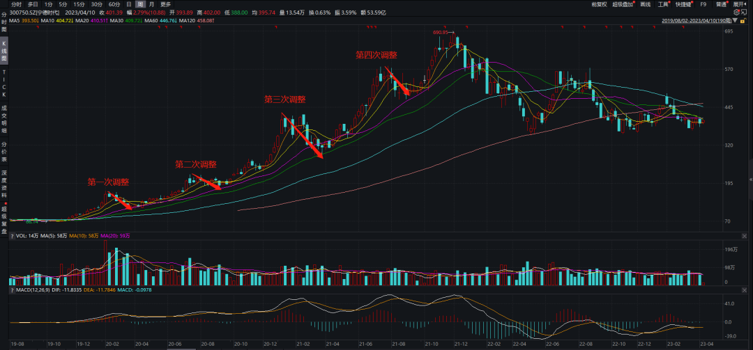 互联网泡沫和“互联网+”行情有点远估计大家不熟悉,这里用前段时间新能源牛市来简单复盘一下吧,典型个股就是宁德时代。从2019年底启动的时候68涨到最高的690,复盘整个10倍的过程里,有4次明显的调整。