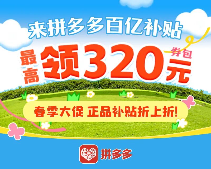 春日焕新季,好价正当时!10日晚22点起,拼多多春季大促来啦!百亿补贴主会场限时狂撒最高320元大额券包等你来拿!叠券再享折上折!