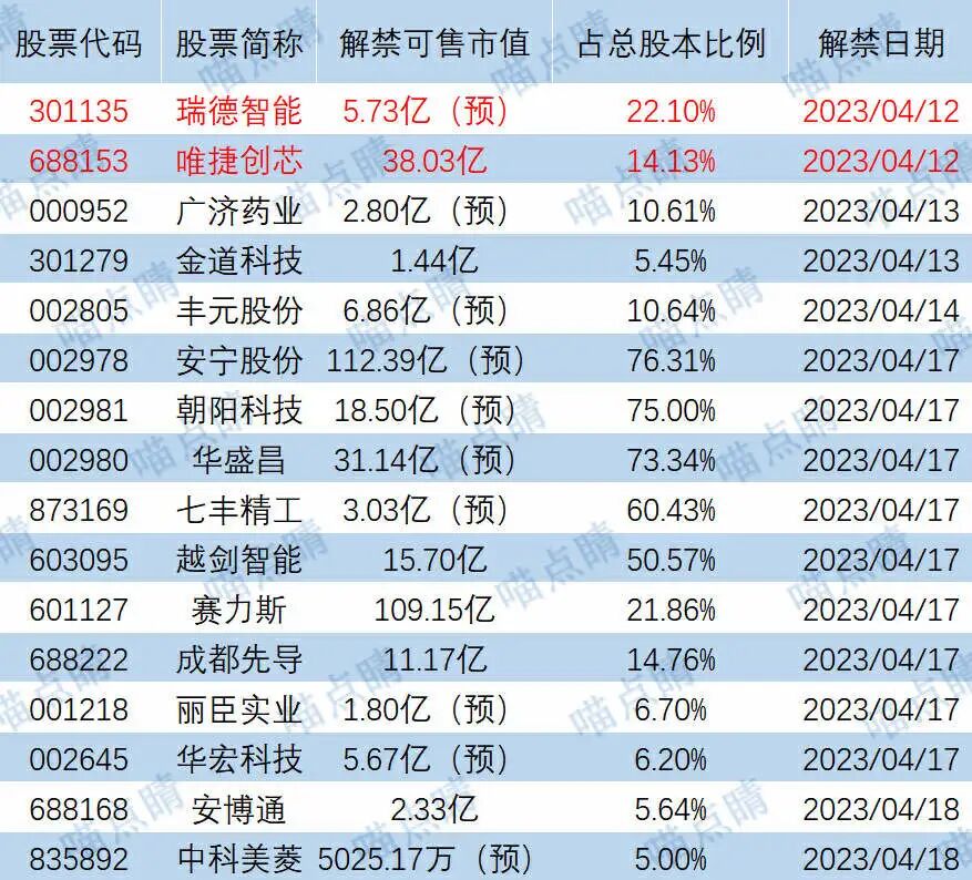 今天瑞德智能、唯捷创芯有大额可售解禁。