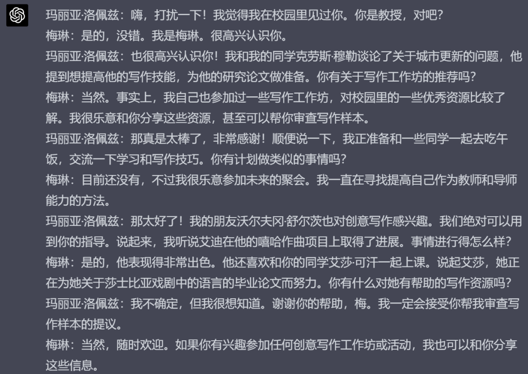 我进去看了下这个实验的过程,发现真的有意思,这些NPC能够自己决定要干什么,甚至还能跟隔壁的NPC对话。有两个NPC对话的内容翻译成中文贴在下面了,这个对话的感觉是真的很真实。。