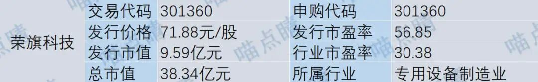 荣旗科技主要从事智能装备的设计和研产销及技术服务,重点面向智能制造中检测和组装工序提供自主研发的智能检测、组装装备。发行价格对应破发率较高,其他指标对应破发率较低。