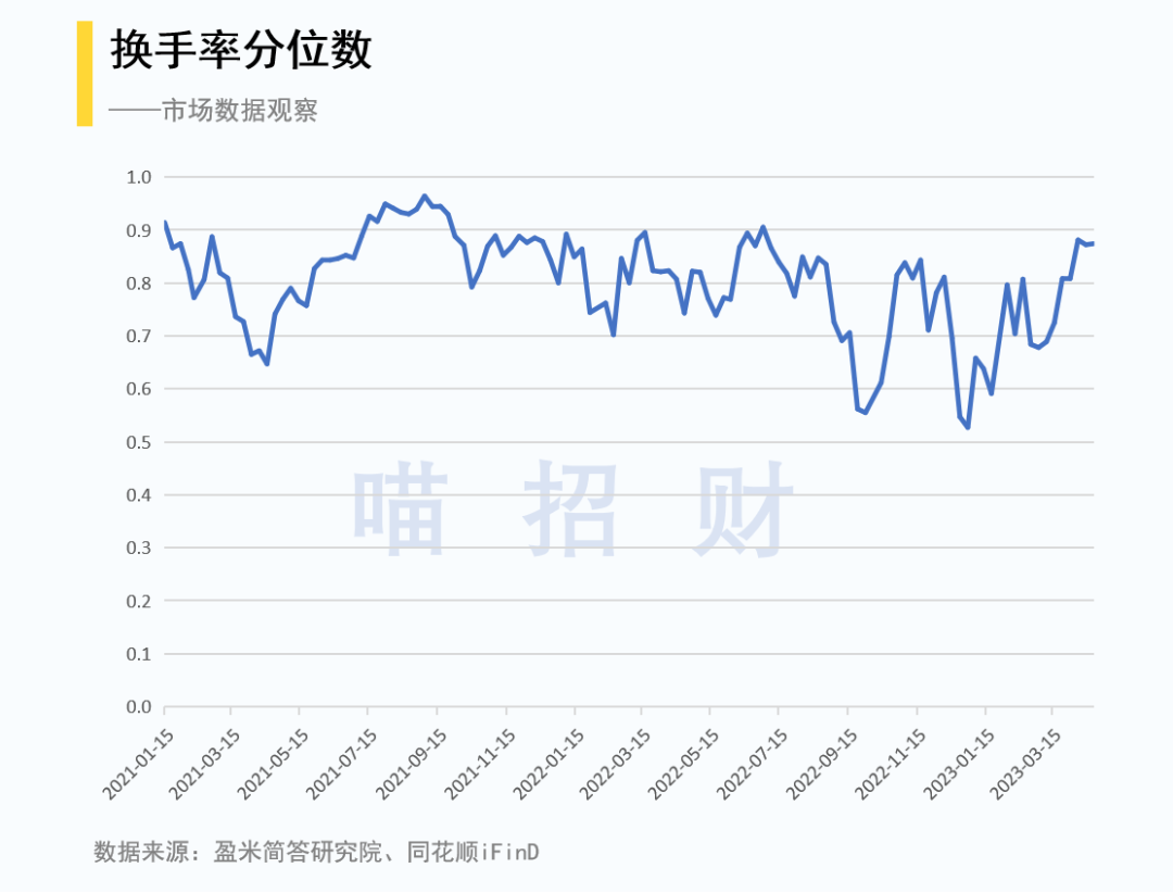 全市场看,换手率分位数保持在87%附近,从时间和幅度的角度看这一轮换手率上行已经比较充分了,后续要注意市场流动性下行的可能。