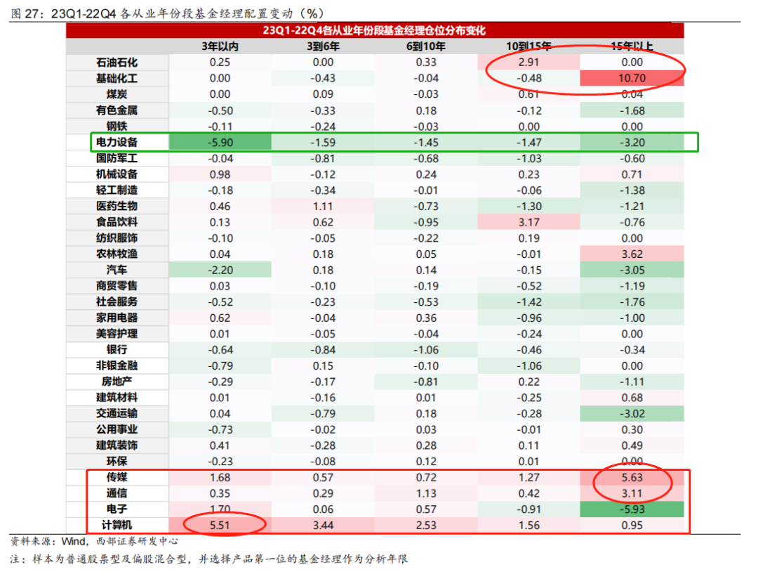 另一张图是从从业年限的角度来看基金经理一季度的调仓,卖出电力设备、买入TMT是共性,但是这里面有一些细节不一样。