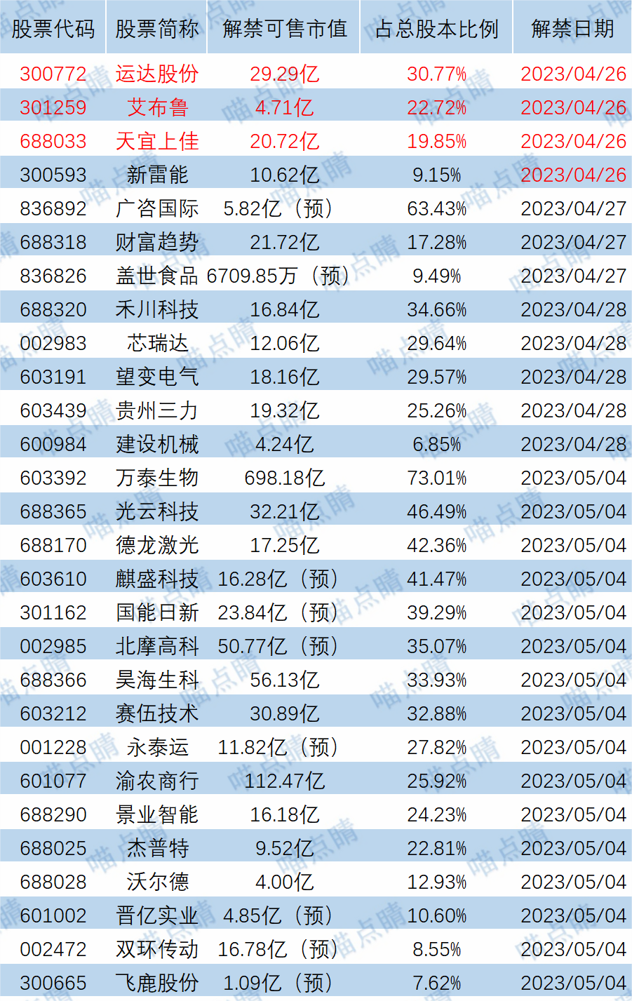 今天运达股份、艾布鲁等有大额可售解禁。