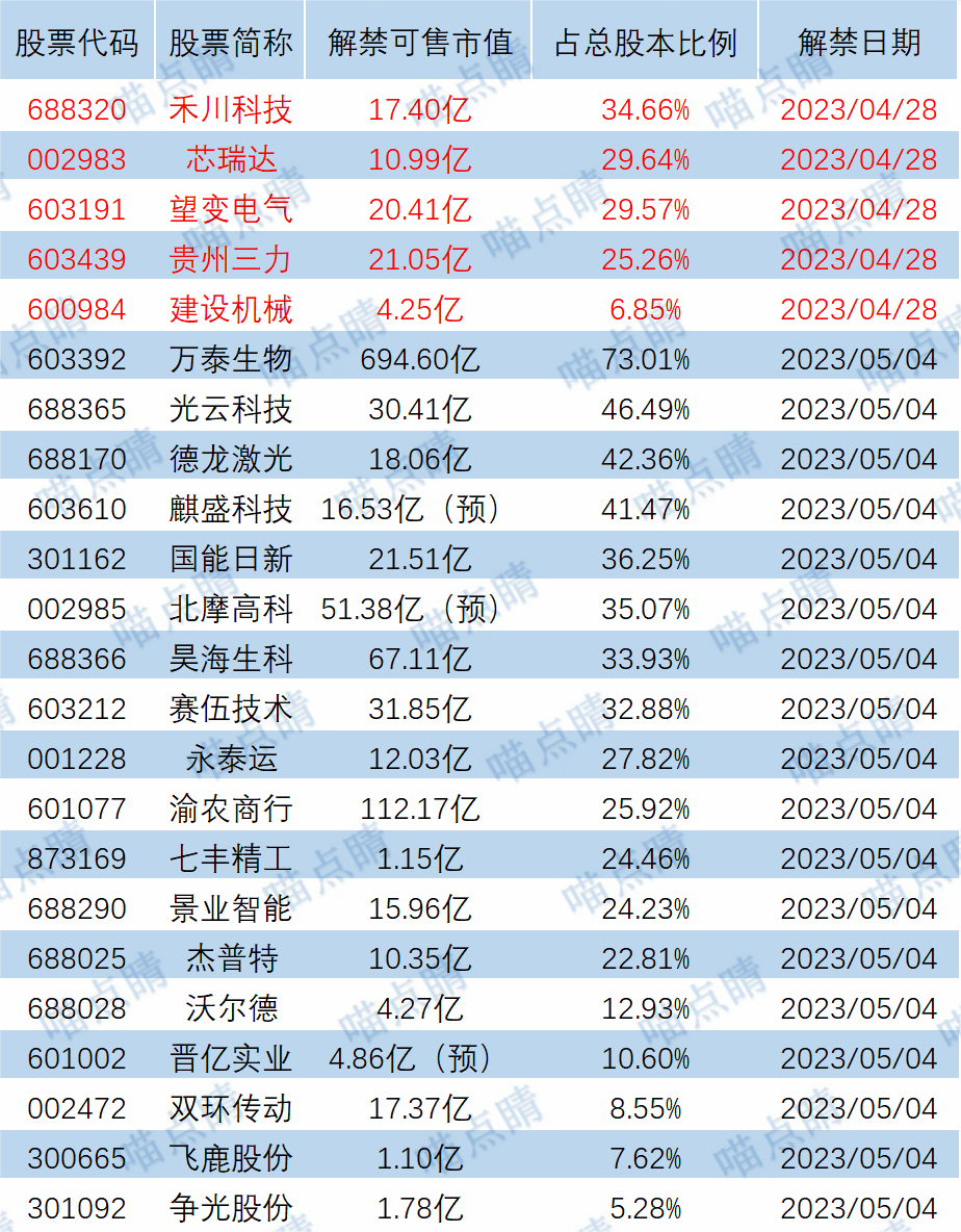 今天禾川科技、芯瑞达等有大额可售解禁。
