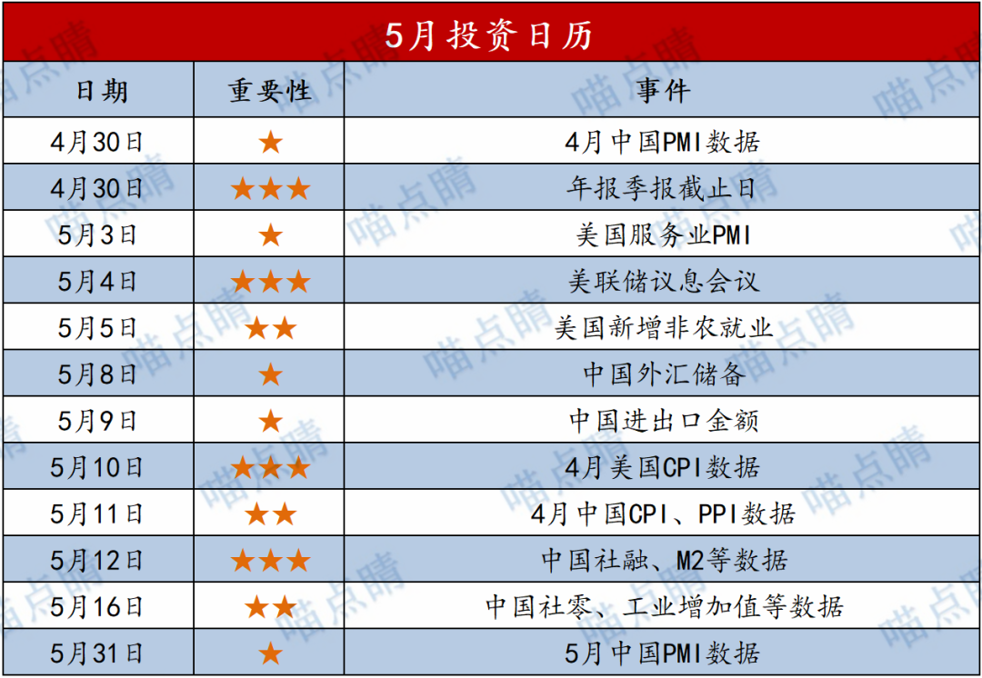 此外,在五月还有不少大事,比如国内CPI表现,被市场担心的通S是否真的存在,都需要数据进一步验证,为此,我提前整理五月投资日历,大伙可以提前看看。另外假期的大事,我们也会在节后第一时间和大家分享,小伙伴们只管安心休息,玩的快心就好。