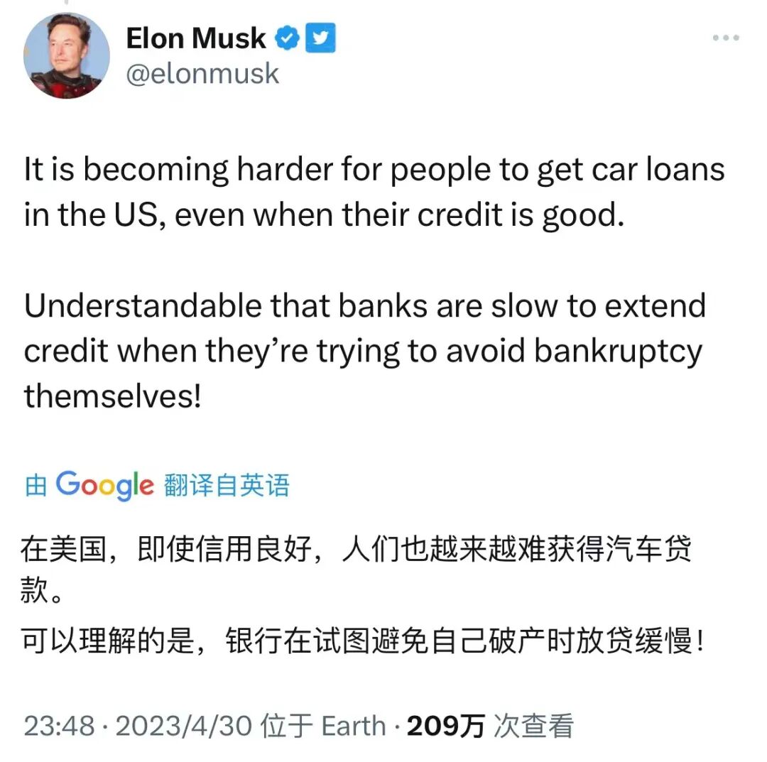 马斯克也对当下的银行业发表了观点,称银行已经在收缩汽车贷款。另外他还认为美联储获取的数据太慢了,当下温和的衰退已经开始。他说的话还是得重视的,毕竟他有特斯拉、推特和Starlink,数据来源和准确性非常及时。
