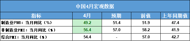 1、4月制造业PMI录得49.2%,环比-2.7%,较3月明显下滑,一方面有3月高基数影响,另一方面更核心的因素是制造业的内外需同步走弱,新订单指数和新出口订单指数均处在历史同期的较低水平。