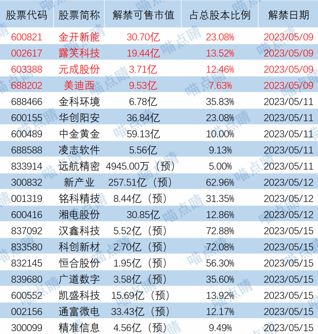 今天金开新能、露笑科技等有大额可售解禁。