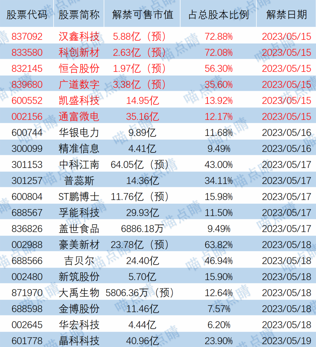 今天汉鑫科技、科创新材等有大额可售解禁。